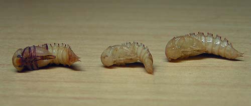 - Frisch verpuppt(rechts), halb entwickelt(Mitte), kurz vor dem schlüpfen(links)