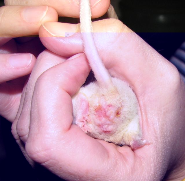 - Typische Bisswunden im Genitalbereich bei unkastriertem Farbmausböckchen nach Revierkämpfen
